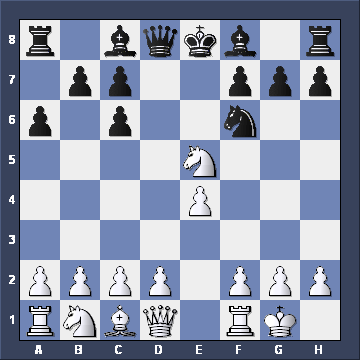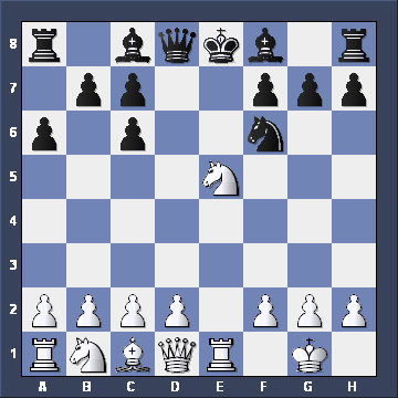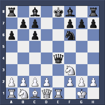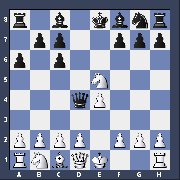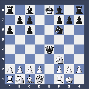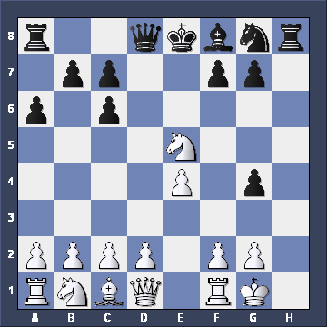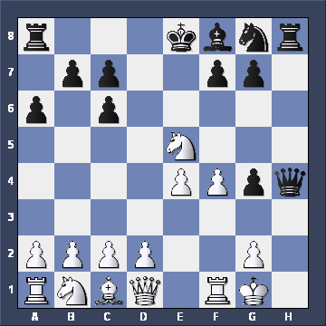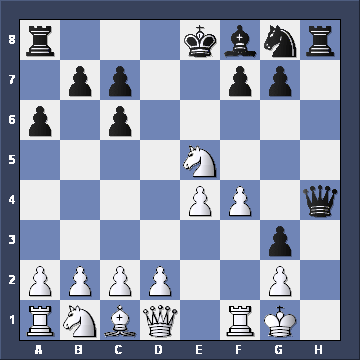 7. h3xg4 h5xg4 8. Nf3xe5 What should Black play next? Qd8-e7