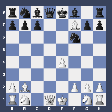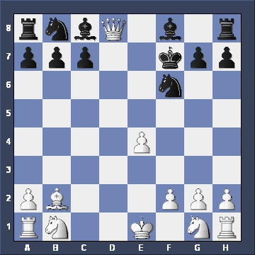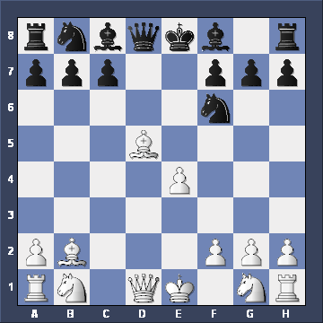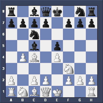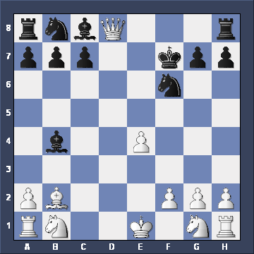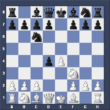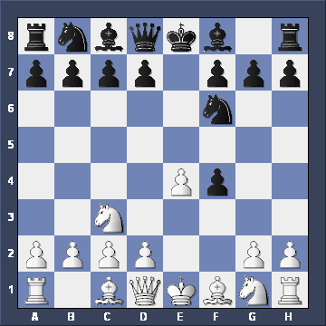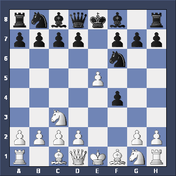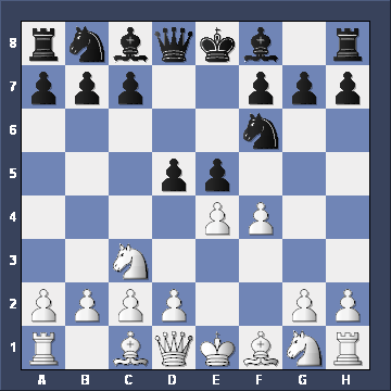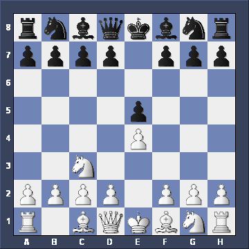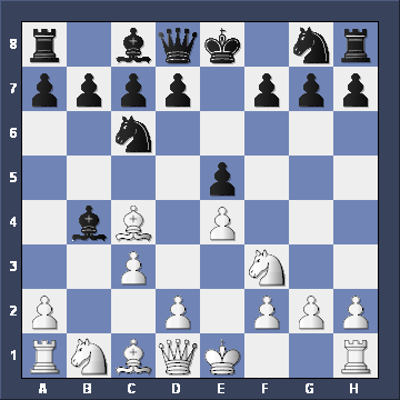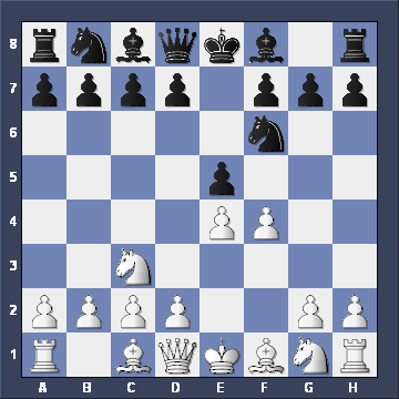 Returning to the position after White's 3rd move, c2-c3, rather than taking the pawns he can strike back in the center at once. Can you see how? (There was a clue earlier!)![]()