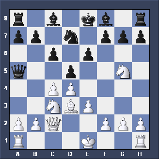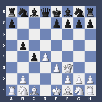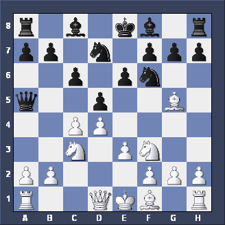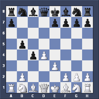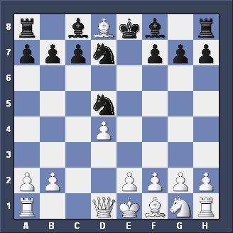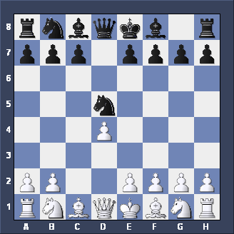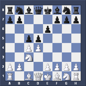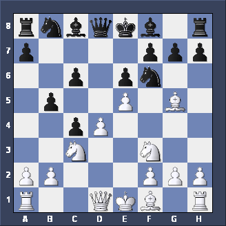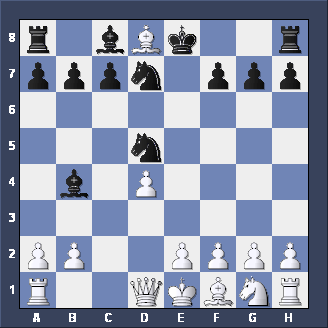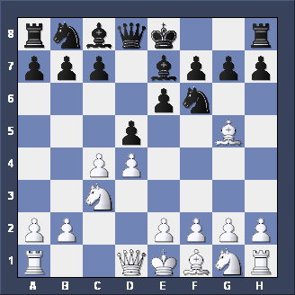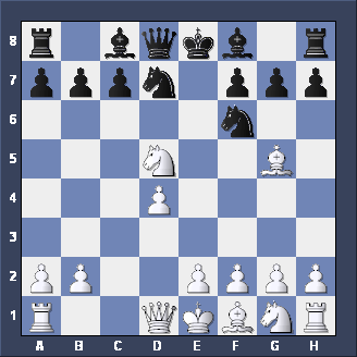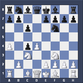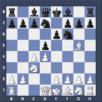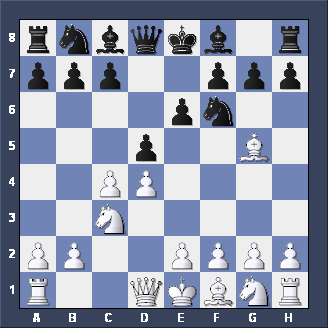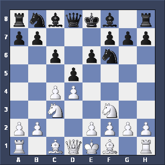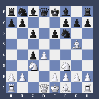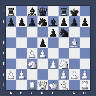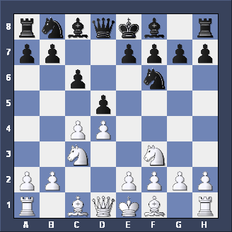 Play might continue like this: 5. Ng1-f3 0-0 6. e2-e3 Nb8-d7 7. Ra1-c1