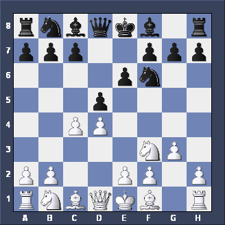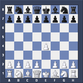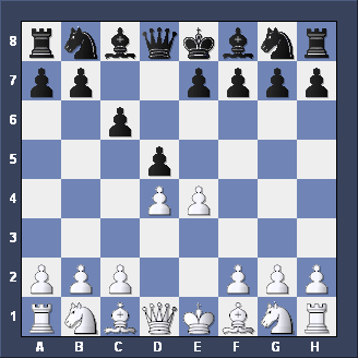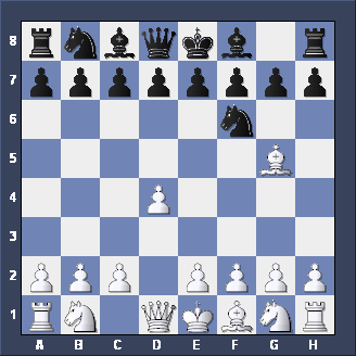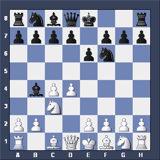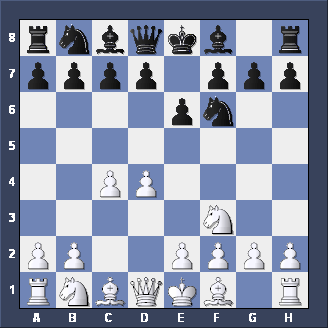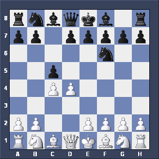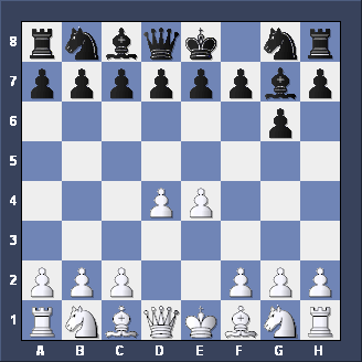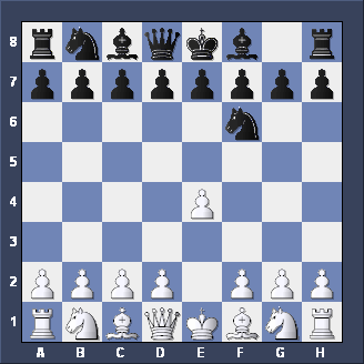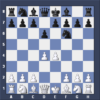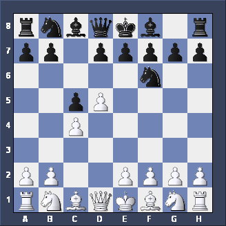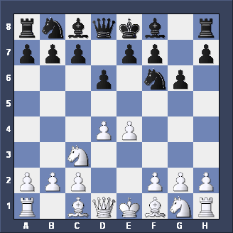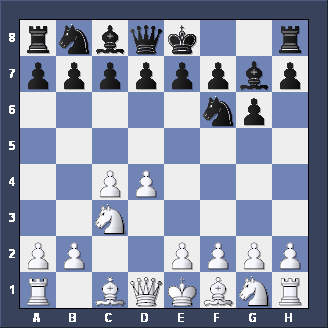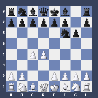 After the moves 1. d2-d4 Ng8-f6 2. c2-c4 e7-e6 3. Nb1-c3 Bf8-b4 we reach this position. This is known as the NIMZO-INDIAN DEFENCE. Black prevents e2-e4 by PINNING the White Knight.