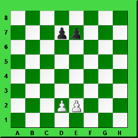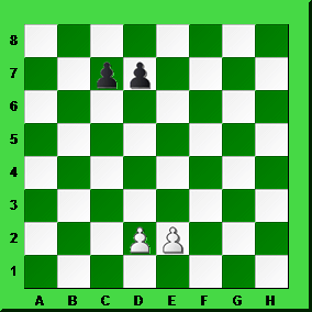 It's a lot harder to work out what's happening with two pawns each, isn't it? Yes - if Black copies White's move exactly, on the same file on his first move he will win with best play. But you have to think on your next move. Suppose I move to e4 and you move to e5. Now if I move to d3, you copy me by moving to d6. But if I move to d4 instead you have to take me. If you copy me here you'll lose. Again, test this out at home or with your friends. |